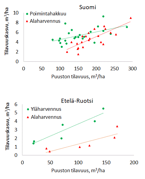 Kasvun kannalta parhaita ovat rinnankorkeusläpimitaltaan 15–20-senttiset puut. Jos harvennushakkuu onnistutaan tekemään niin, että kasvamaan jää runsaasti tuon paksuisia puita, metsikön tilavuuskasvu pysyy hyvänä, vaikka kasvavia puita poistetaankin. Mitä pidempään metsää vodaan harventaa niin, että kasvamaan jää runsaasti hyvän kasvuvaiheen puita, sitä parempaan pitkän aikavälin tuotokseen päästään.