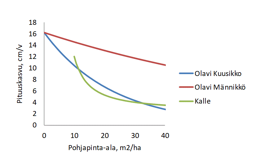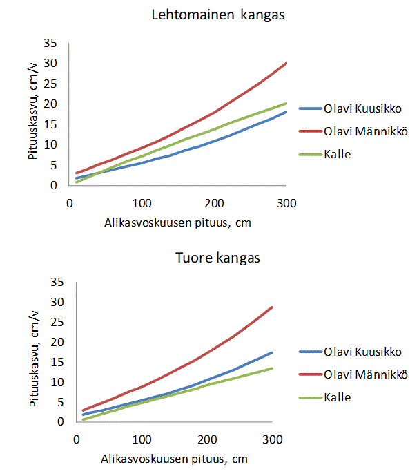 Kuvassa 1 on vertailtu Eerikäisen ja Laihon pituuskasvumallien ennusteita. Eerikäisen malli ennustaa lehtomaisella kankaalla hieman parempaa ja tuoreella kankaalla heikompaa kasvua, mutta kokonaisuutena pituuskasvut ovat lähellä toisiaan. Laihon mallien mukaan alikasvoskuusten kasvu on paljon parempaa männiköissä ja koivikoissa kuin puhtaissa kuusikoissa. Kuvasta 2 nähdään, että alikasvoskuusen pituuskasvu hidastuu metsikön pohjapinta-alan kasvaessa paljon hitaammin männikössä kuin kuusikossa.