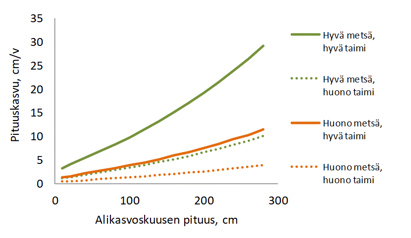 Jos erirakenteisessa metsässä on runsaasti alikasvosta, metsikön tuotoksen kannalta merkitystä on eniten parhaiten kasvavilla puilla. Jos hakkuussa poistetaan 300 puuta/ha ja alikasvosta on 1800 kpl/ha, alikasvospuista 1/6 riittää ”korvaamaan” poistetut puut. Kuvassa 3 käyrät ”Hyvä metsä, hyvä taimi” ja ”Huono metsä, hyvä taimi” ovat noiden puiden kasvuja Laihon mallin mukaan.