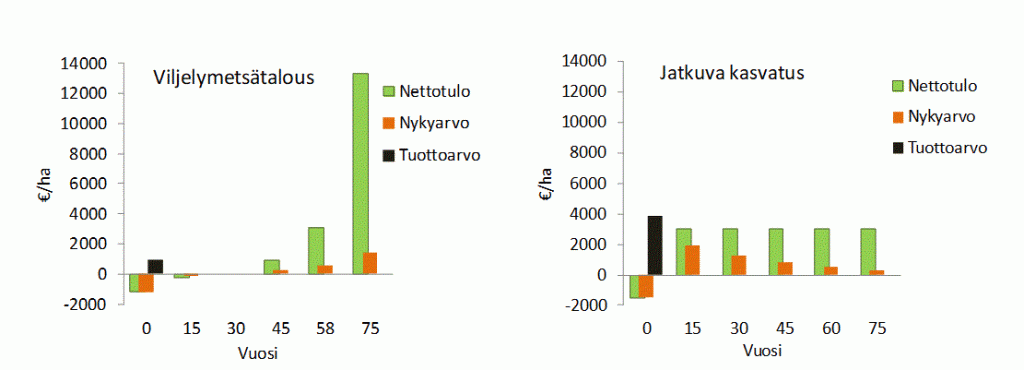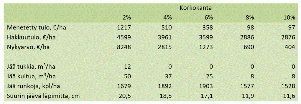 Diskonttaus pienentää nykyarvoa sitä enemmän, mitä suurempaa korkokantaa käytetään ja mitä myöhemmin tuotot saadaan. Korkokannan suurentuessa viljelymetsätalouden nykyarvo painuu vääjäämättä negatiiviseksi, vaikka hakkuuvuodet ja hakkuutapa optimoitaisiin erikseen jokaisella korkokannalla. Näin ei käy jatkuvan kasvatuksen vaihtoehdossa, jos jäljelle jätettävän puuston määrä ja rakenne optimoidaan jokaisella korkokannalla. Korkonannan suurentuessa jäljelle jätettävän puuston määrä ja arvo pienenevät. Tulot pienenevät myös, mutta nykyarvo säilyy kuitenkin aina positiivisena.