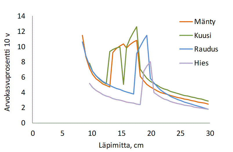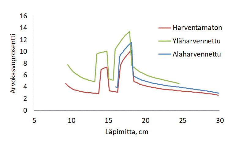 Kuvassa 2 on puolestaan erirakenteisissa metsiköissä kasvavien puiden suhteellinen arvokasvu seuraavan 10 vuoden aikana. Havupuilla 12–20 cm:n puut tuottavat hyvin, jos metsänomistaja voi tukin lisäksi myydä pientukkia. Toinen erittäin hyvän suhteellisen arvokasvun läpimitta-alue ovat alle 10 cm:n puut.