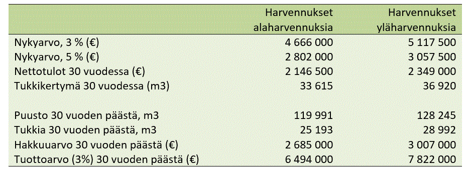 Suuraavassa taulukossa ylä- ja alaharvennuksen vertailussa on käytetty Hynysen ym. kasvumalleja. Noin 950 hehtaarin alueen metsikkökuvioille on simuloitu tasaikäismetsätalouden vaihtoehtoja 30-vuotiskaudeksi käyttämällä kasvatushakkuissa joko ala- tai yläharvennusta. Jokaiselle metsikölle on valittu käsittely, joka maksimoi kolmen prosentin korolla lasketun nettotulojen nykyarvon, kun myös loppupuuston arvo otetaan huomioon. Nähdään, että yläharvennus on kaikilla mittareilla alaharvennusta parempi. Nettotulojen nykyarvo on 7–8 % parempi ja metsän arvo 30 vuoden päästä 20 % parempi. Yläharvennus tuottaa paremman nettotulon ja suuremman tukkikertymän.
