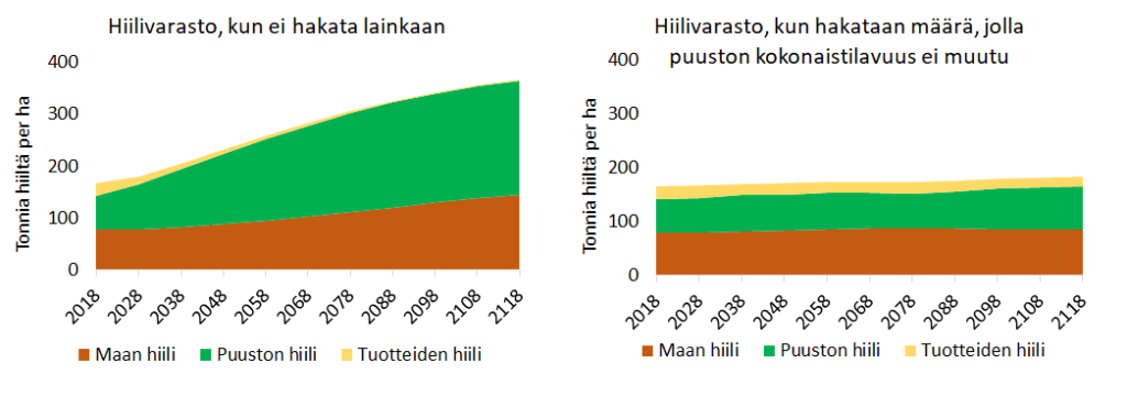 Mitä enemmän metsiä hakataan, sitä hitaammin metsän hiilivarasto suurenee, eli sitä vähemmän metsätalous on poistanut hiiltä ilmakehästä. Suuri tilavuuskasvu ei tuota ilmastohyötyä, jos metsiä hakataan kasvun verran, ja hakattujen puiden hiili päästetään saman tien takaisin ilmakehään.