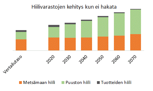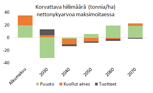 Alla oleva kuva osoittaa, että metsänomistaja joutuisi maksamaan ensimmäisen 10-vuotiskauden hakkuusta liian suuren hiilikorvauksen, jos korvaus perustuisi pelkästään puuston hiilivarastoon. Siinä jäisi huomiotta se, että hakkuu suurentaa sekä tuotteiden että metsämaan hiilivarastoa.