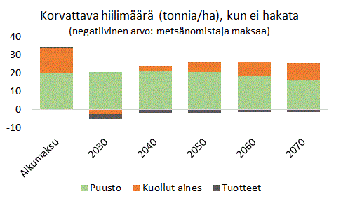 Alkumaksujen jälkeen metsänomistaja saisi tasaiseen tahtiin korvausta lähinnä puuston hiilivaraston kasvattamisesta (laskelmassa on oletettu, että maksut tapahtuvat 10 vuoden välein). Korvausta vähentäisi kuitenkin se, että rauhoituksen seurauksena tuotteiden hiilivarasto pienenisi. Aluksi pienenisi myös metsämaan hiilivarasto, koska hakkuutähteitä ei olisi. Myöhemmin metsämaan hiilivarasto lähtisi kasvuun, kun kariketuotanto ja puiden kuoleminen lisääntyisivät.