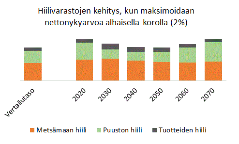 Jos saman metsän omistaja antaa metsänsä kompensaatiokauppaan mutta maksimoi puuntuotannon nettonykyarvoa, hän saa saman alkukorvauksen kuin rauhoitettaessa. Puuston hiilivarasto kuitenkin pienenee ensimmäisinä vuosikymmeninä hakkuiden seurauksena (kuva alla). Toisaalta hakkuut suurentavat tuotteiden hiilivarastoa ja aluksi myös metsämaan hiilivarastoa.