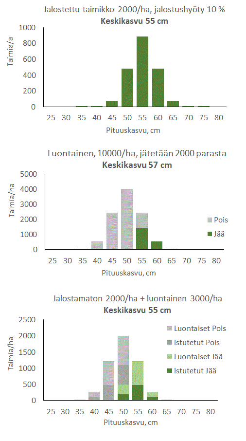 Luonnontaimikoissa tapahtuu luontaista ja ihmisen tekemää valintaa. Kasvamaan jäävät yleensä parhaat taimet. Ne voivat kasvaa vähemmän, yhtä paljon tai enemmän kuin jalostetuin taimin perustettu viljelytaimikko. Alla olevassa kuvassa on oletettu, että maatiaistaimien keskimääräinen pituuskasvu on 50 cm vuodessa ja pituuskasvun keskihajonta on 5 cm. Jalostetuilla taimilla pituuskasvu on 10 % parempi ja kasvun hajonta 10 % pienempi. Esimerkistä käy ilmi, että jalostettujen taimien keskikasvu ei ole yhtään parempi kuin luontaisesti syntyneen taimikon kasvu, kun 10000 taimesta jätetään kasvamaan 2000 parasta. Kasvu ei myöskään ole parempi kuin maatiaistaimikossa, jossa kasvamaan on jätetty istutustaimien (2000 kpl/ha) ja luontaisen täydennyksen (3000 kpl/ha) parhaimmisto.