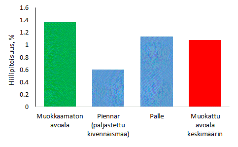 Sutisen ym. tutkimuksessa mitattiin maan hiilipitoisuutta Pohjois-Suomen aurausalueilla 12 vuotta maankäsittelyn jälkeen. Hiiltä oli eniten käsittelemättömissä kohdissa ja vähiten aurausjäljen vaoissa ja pientareissa (kuva 1). Aurauspalteissa, joihon oli käännetty kaksinkertainen humuskerros, oli 12 vuoden kuluttua aurauksesta vähemmän hiiltä kuin käsittelemättömissä kohdissa. Tulosten perusteella voidaan laskea, että pelkkä muokkaus oli vähentänyt koko avohakkuualan keskimääräistä hiilipitoisuutta noin 20% (vihreän ja punaisen pylvään ero kuvassa 1).