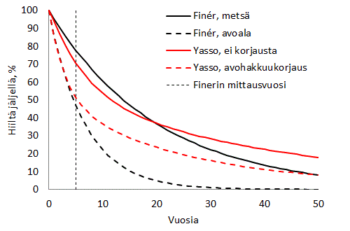 Kuvan 2 musta yhtenäinen viiva kuvaa kuolleen puuaineksen hajoamista hakkaamattomassa metsässä ja musta katkoviiva on hajoamisnopeus avoalalla, kun käytetään Finérin ym. laskemia hajoamisnopeuksia. Punainen yhtenäinen viiva taas on Yasso15-mallilla simuloitu hajoaminen. Punainen katkoviiva on sellainen Yasso-simulointi, jossa mallin parametreja (vuoden keskilämpötila, sadanta, lämpötila-amplitudi) on säädetty niin, että Finérin ym. havaitsema avohakkuuvaikutus heijastuisi Yasso-simulointiin.