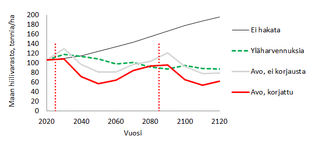 Kuvassa 3 on simuloitu metsämaan hiilen kehitystä, kun lehtomaisen kankaan uudistuskypsä kuusikko avohakataan, muokataan ja viljellään, tai metsikköä käsitellään toistuvin yläharvennuksin. Tulokset on laskettu Monsu-ohjelmalla, joka käyttää Yasso-mallia kuollen orgaanisen aineksen hajoamisen simulointiin. Avohakkuuvaihtoehdossa alue avohakataan uudelleen vuonna 2085. Avohakkuuvaihtoehdossa maan hiilimäärän kehitys on simuloitu kahdella tavalla: ilman avohakkuukorjausta (harmaa viiva) ja kuvan 2 osoittamalla avohakkuukorjauksella (punainen viiva). Yasso-korjausta on pienennetty puuston varttuessa niin, että korjaaminen loppuu, kun puuston pohjapinta-ala on 10 m2/ha.
