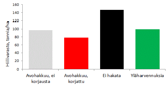 Yläharvennuksessa (vihreä katkoviiva kuvassa 3) metsämaan hiilivarasto on vakaampi ja keskimäärin selvästi suurempi kuin avohakkuumetsätaloudessa, varsinkin jos hajoamisnopeuteen tehdään avohakkuukorjaus. Jos metsää ei hakata lainkaan, metsämaan hiilivarasto 100 vuoden päästä on kaksinkertainen hakkuuvaihtoehtoihin verrattuna.
