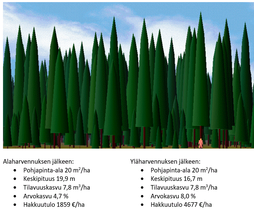 Entäpä, jos metsänomistajalla on varttunut melko erirakenteinen kuusikko (kuva 2), ja hän pohtii, pitäisikö sitä käsitellä tasaikäismetsätalouden alaharvennuksella vai jatkuvan kasvatuksen yläharvennuksella? Metsikön pohjapinta-ala on 30 m2/ha a keskipituus 18.7 m. Sekä ala- että yläharvennuksessa pohjapinta-alasta poistetaan kolmannes. Keskipituus suurenee alaharvennuksessa 19.9 metriin ja pienenee yläharvennuksessa 16.7 metriin. Tässä tapauksessa Hynysen ym. malli ennustaa, että hakkuun jälkeinen tilavuuskasvu on molemmissa tapauksissa sama, mutta pohjapinta-alan kasvu on yläharvennuksen jälkeen 15 % parempi. Mainittakoon, että hakkuutulo on yläharvennuksessa yli kaksi kertaa suurempi ja kuutiometriä kohti laskettu korjuukustannus 34 % pienempi. Jäävän puuston suhteellinen arvokasvu seuraavan 5 vuoden aikana on alaharvennuksen jälkeen 4,7 % ja yläharvennuksen jälkeen 8 %.