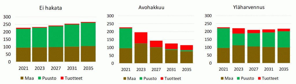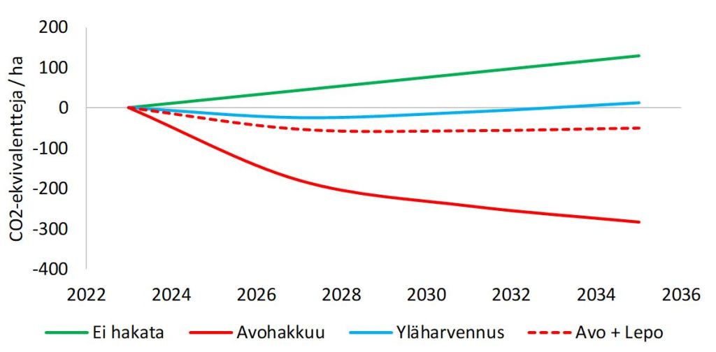 Näitä asioita on havainnollistettu alla olevassa kuvassa. Kuva esittää kumulatiivista hiilitasetta hiilidioksidiekvivalentteina ilmaistuna vuoteen 2035 mennessä. Negatiivinen tase tarkoittaa, että metsätalous on nettopäästö. Kuva johtaa samoihin päätelmiin kuin varastojen muutokset, vaikka laskelmassa ovat nyt mukana puun käytön korvausvaikutukset. Hakkaamatta jättäminen pitää kuusikon hiilinieluna, yläharventaminen on hiilineutraalia ja avohakkuu tekee metsiköstä hiilen lähteen.