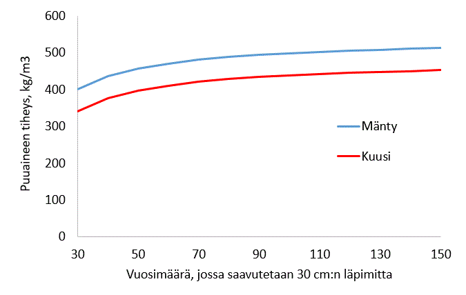 Pentti Hakkila laski laajojen aineistojen perusteella jo vuonna 1979, että puuaineen tiheys on sitä pienempi, mitä nopeammin puu kasvaa (tutkimus löytyy täältä). Riippuvuus havaittiin männyllä, kuusella ja koivulla.