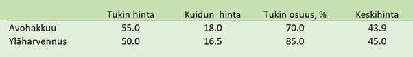 Hakkuukertymä oli useimmilla kuvioilla reippaasti yli 100 m3/ha ja tukkiosuus oli suuri, varsinkin kivennäismaiden kuusivaltaisilla kuvioilla (kuvat 1–2). Vaikka tukin hinta olisi pienempi kuin avohakkuussa, myydyn kuutiometrin keskihinta voi silti olla yläharvennuksessa parempi. Alla oleva kuvitteellinen esimerkki havainnollistaa asiaa (hinnat €/m3):