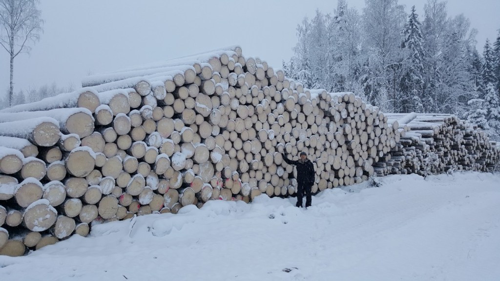 Ohjeiden lisäksi tein pari pientä mallileimausta, joissa nauhoitin puut, jotka tulee poistaa. Toisella värillä nauhoitin puita, jotka tulisi jättää kasvamaan. Kiertelin metsikkökuvioita tunnin verran hakkuukoneen kuljettajan kanssa käyden läpi hakkuun periaatteita. Myöhemmät palstalla käynnit olivat hakkuujäljen ja komeiden tukkikasojen ihastelua. Tukkikasojen vieressä oli pieniä kuitupuunyssäköitä.
