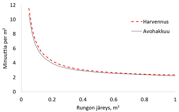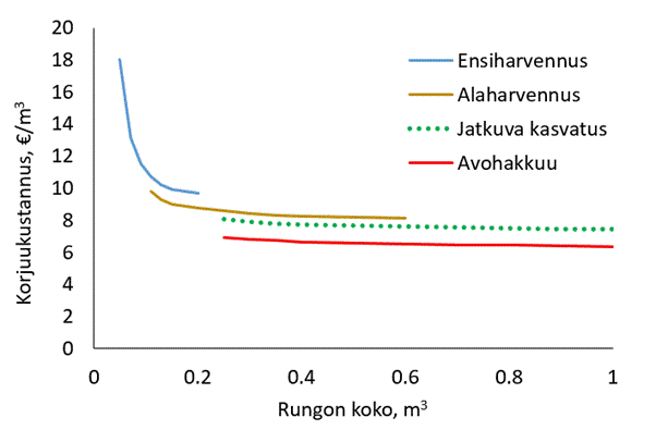 Ajokoneen tuottavuus riippuu lähikuljetusmatkan ja maaston lisäksi siitä, kuinka paljon metsässä on poisajettavaa puuta yhtä ajourametriä kohti. Tässä suhteessa avohakkuu peittoaa yläharvennuksen. Poistettavien runkojen koon vaikutus hakkuun kokonaiskustannukseen (hakkuu + lähikuljetus) on kuitenkin edelleen selvä (kuva 5). Kuvasta 5 käy ilmi tunnettu tosiasia, että tasaikäismetsän ensiharvennus on kallista, varttuneen metsän alaharvennus selvästi halvempaa, ja avohakkuu vieläkin halvempaa. Jatkuvan kasvatuksen yläharvennus on varttuneen metsän alaharvennuksen ja avohakkuun välissä.