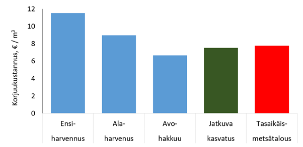 Kun lasketaan kertymällä painotettu keskiarvo tasaikäismetsätalouden eri hakkuiden kustannuksista, saadaan tulokseksi, yllätys ylläts, että jatkuvan kasvatuksen hakkuu onkin keskimäärin halvempaa (kuva 6). Vertailun tulos on tietenkin tapauskohtainen, joten diplomaattisempi päätelmä on, että korjuukustannuksissa ei ole suurta eroa, kun vertailuun sisällytetään tasaikäismetsätalouden kaikki hakkuut.