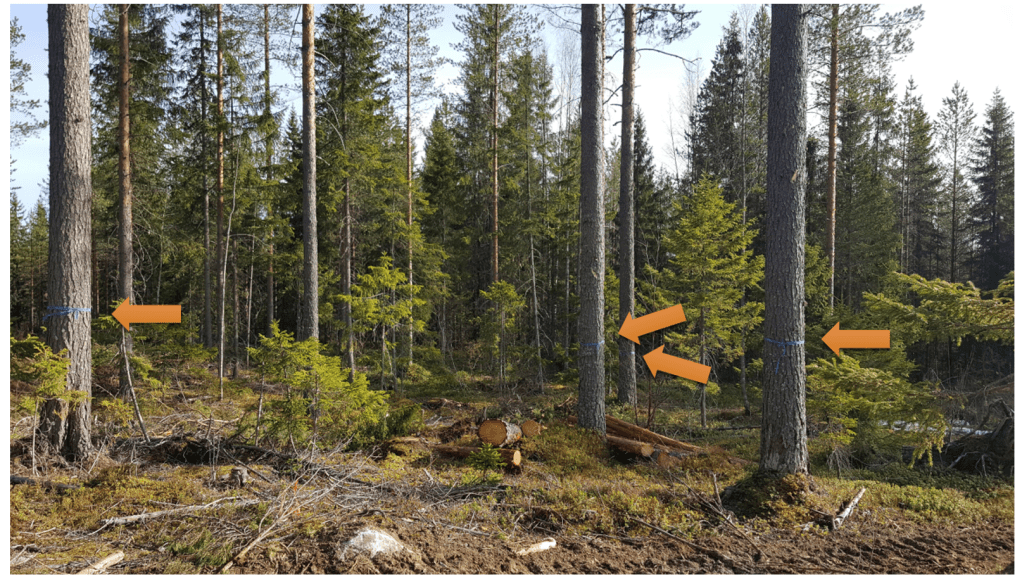 Tein pariin kohtaan pienen mallileimauksen, joissa nauhoitin ne tukkiungot, joita ei pidä poistaa. Sen lisäksi nauhoitin säästöpuut sekä sinne tänne puita, jotka halusin poistaa. Jälleen kerran hakkuukoneen kuljettajat olivat heti juonessa mukana. Kuljettajilla on ilmeisen hyvä käsitys siitä, millaisista puista omistaja saa tuloa, millaiset puut lisäävät nopeasti arvoaan ja millaisten puiden poisto tuottaa hitaasti hakkuukertymää ja on sen vuoksi kallista.