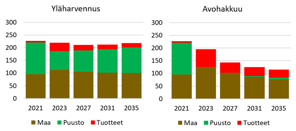 Näinä aikoina hiilidioksidin poisto ilmakehästä on yksi tärkeimpiä metsän ekosysteemipalveluita. Kriittinen aika, jona ilmastonmuutos ja ilman hiilidioksidipitoisuuden nosu pitäisi saada pysähtymään, on varsin lyhyt, kenties ainoastaan 15 vuotta. Alla olevasta kuvasta selviää, että jos metsässä tekee avohakkuun, puolet metsän hiilivarastosta vapautuu ilmakehään seuraavan 15 vuoden aikana. Metsä on muuttunut hiilinielusta hiilen lähteeksi. Myöhemmin uusi puusukupolvi rupeaa tietenkin sitomaan jälleen hiiltä, kun kasvavan biomassan määrä. Tästä tulevaisuuden hiilensidonnasta ei kuitenkaan ole juuri hyötyä tämänhetkisen ilmasto-ongelman ratkaisemisessa. Tätä taustaa vasten itse kukin voi pohdistella, kuinka vastuullista metsätaloutta avohakkuu edustaa nyt ja lähivuosina. Yläharvennuskin heikentää hiilinielua, mutta sen vaikutus on huomattavasti pienempi ja lyhytkestoisempi kuin avohakkuussa.