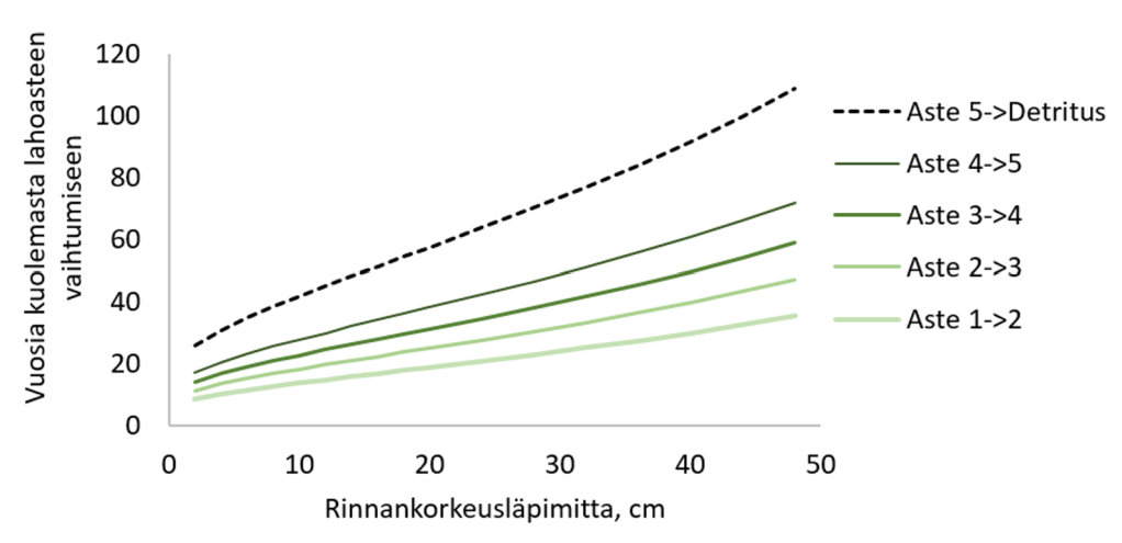 Jos pohjoisen Suomen metsän avohakkaa, uudelta sukupolven puilta kestää 150 vuotta saavuttaa järeä koko. Sen jälkeen kuluu toiset 150 vuotta siiten, että järeitä puita alkaa kuolla. Kuoleman jälkeen menee vielä 50 vuotta lahoasteen 5 saavuttamiseen. Avohakkuun jälkeen kestää siis 350 vuotta, ennen kuin metsikkö alkaa tuottaa uudelleen järeää lahoasteen 5 puuta.