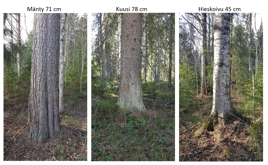 Jos halutaan selvittää suurten puiden määrää Suomen metsissä, siihen ei tarvita koskaan-vertailuja vaan analyysiä metsien tämänhetkisestä tilanteesta. Aloitin selvitykset omalta 30 hehtaarin Tuupovaaran palstaltani, josta etsin suurimman männyn, kuusen ja koivun. Suurin mänty oli läpimitaltaan 78 cm, suurin kuusi 65 cm ja suurin koivu samoin 65 cm. Kotipihallani Joensuussa kasvaa 64 cm paksu mänty ja kesämökkini pihalla Rääkkylässä 62 cm paksu mänty.