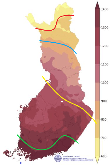 Ei siis voi sanoa, että kannattavan viljelymetsätalouden nollaraja kulkisi jossain tietyssä paikassa, koska rajan sijaintiin vaikuttavat mm. korkokanta ja kasvupaikan viljavuus. Alla olevassa kuvassa olen hahmotellut keskihyvän kasvupaikan (tuore kangas, mustikkatyyppi) nollarajan Ilmatieteen laitoksen lämpösummakartalle, kun korko on 1, 2, 3 tai 4 %. Nollarajojen laskennassa on käytetty uusimpia kasvumalleja ja tämänhetkistä maanmuokkauksen, viljelyn ja taimikonhoidon kustannustasoa.