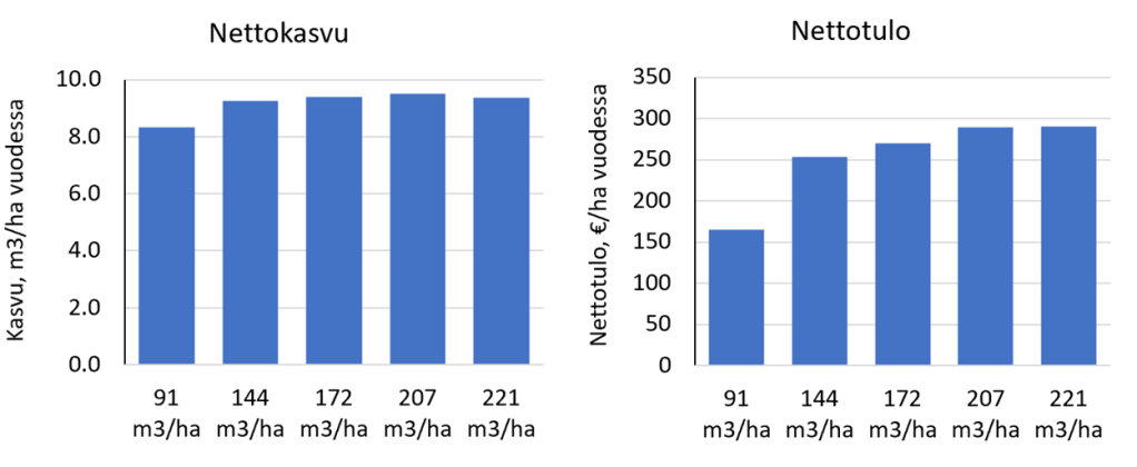 Keskimääräinen vuotuinen nettokasvu (puiden kasvu vähennettynä luonnonpoistumalla) 50 vuoden laskenta-aikana oli suurimmillaan, kun puuston keskitilavuus oli 207 m3/ha (kuva 1). Jos siis kasvua halutaan maksimoida, eteläsuomalaisen metsän tulisi olla varsin runsaspuustoinen. Metsänomistajan saamat pitkän aikavälin keskimääräiset nettotulot olivat sitä suuremmat, mitä enemmän metsässä oli puuta.