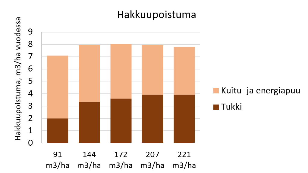 Metsäteollisuuden puunsaanti kärsi selvästi, kun keskipuusto oli alle 100 m3/ha (kuva 2). Hakkuupoistuma maksimoitui, kun keskitilavuus oli 172 m3/ha, mutta hakkuupoistuman erot olivat pieniä keskitilavuuksien 144 ja 221 m3/ha välillä. Tukin osuus hakkuupoistumasta suureni, kun metsän keskitilavuus lisääntyi, mikä yhdessä pienenevien metsänhoitomenojen kanssa selitti sen, että metsänomistajan saama nettotulo oli sitä suurempi, mitä enemmän metsässä oli puuta.