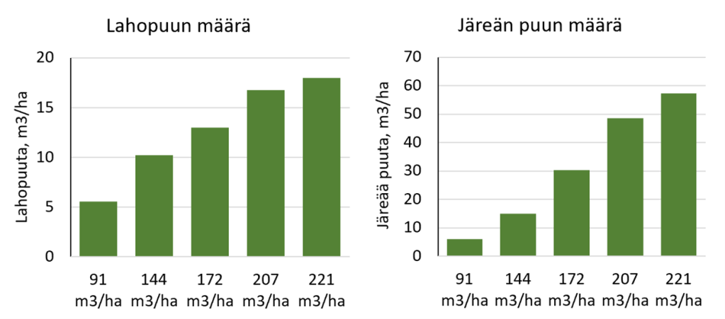 Mitä runsaspuustoisempana metsä pidetään, sitä enemmän sinne kertyy lahopuuta ja järeää puustoa (kuva 3). Molemmat ovat eduksi monimuotoisuudelle, ja järeät puut parantavat lisäksi metsän virkistysarvoja. Suurentamalla metsänsä keskipuustoa metsänomistaja voi paitsi lisätä tulojaan myös edistää monimuotoisuutta ja parantaa metsän maisema- ja ulkoiluarvoa.