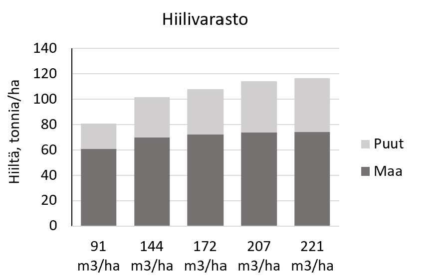 Runsaspuustoisen metsän elävässä biomassassa on paljon hiiltä (kuva 4, Puut). Myös metsämaan hiilivarasto suurenee, kun puuston määrää lisätään. Koska tukin hakkuupuistuma suurenee puuston keskitilavuuden suurentuessa, runsaspuustoiset metsät mahdollistavan myös puutuotteiden hiilivaraston suurentamisen.