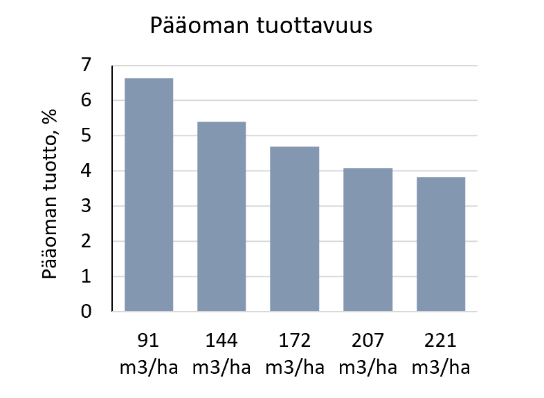 On yksi asia, joka ei yleensä parane, kun puuston keskitilavuutta suurennetaan, nimittäin pääoman tuottavuus. Pääoman tuottavuus tarkoittaa puuston arvokasvua jaettuna puuston ja maapohjan yhteisellä arvolla. Kuvan 5 pylväät on laskettu olettamalla, että maapohjan arvo (paljaan metsämaan arvo) on 2000 euroa/ha.