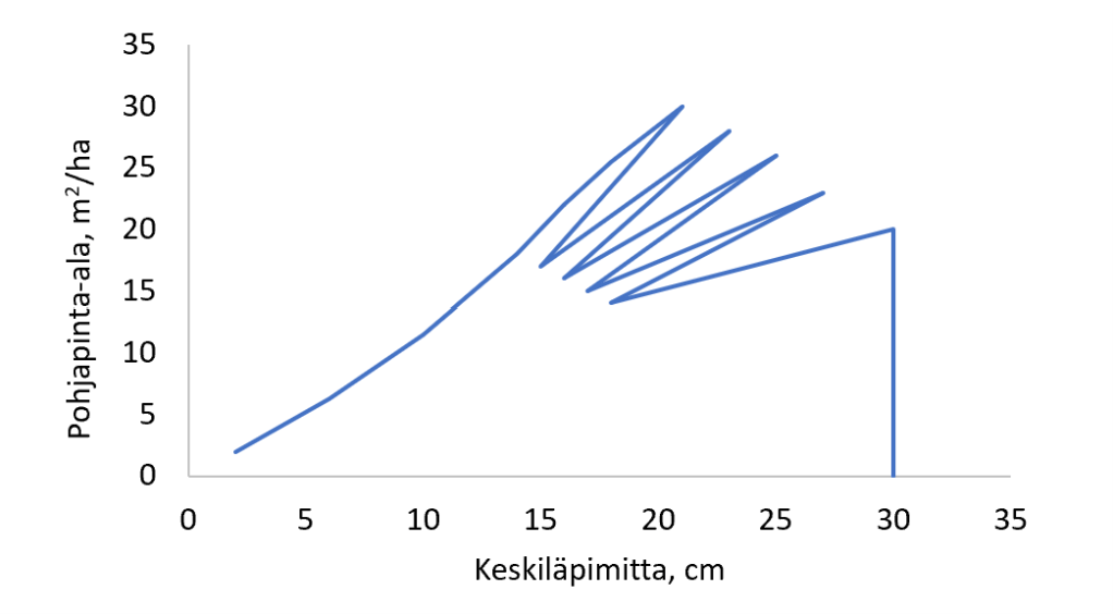 Puusto tuottaa parhaiten, kun puiden läpimitta rinnankorkeudelta on 13–17 cm, koska tämän kokoiset puut kasvavat nopeasti ja puissa tapahtuu arvosiirtymää kuidusta tukiksi. Taloudellisesti optimaalisessa hakkuussa metsikkö palautetaan rakenteeseen, jossa 13–17-senttisiä puita on paljon. Jos metsässä on alikasvosta ja muuta pienpuustoa, se jätetään hakkaamatta, koska näistä puista tulee aikanaan 13–17-senttisiä puita. Taloudellisesti ihanteellinen harvennushakkuu on yläharvennus, jossa pienennetään sekä pohjapinta-alaa että keskiläpimittaa (kuva 6). Mitä useampia kertoja ihanteellinen hakkuu voidaan toistaa, sitä paremmin metsätalous kannattaa. Erirakenteinen nuori metsä on paras lähtökohta pitkään jatkuvalle hyvälle tuottavuudelle (kuva 7).