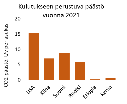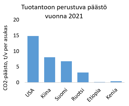 Kun lasketaan vuotuiset CO2-päästöt asukasta kohti, Kiina on aivan viime vuosina kirinyt Suomen ohi. Toisaalta suomalaisen päästöt ovat peräti kaksinkertaiset parhaaseen verrokkiin eli ruotsalaiseen verrattuna!
