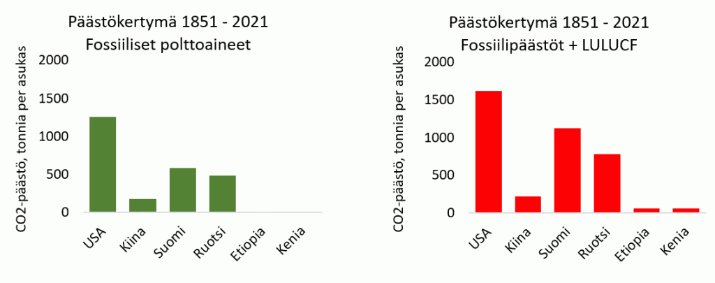 Edellisen kuvan vasen pylväikkö on laskettu fossiilipäästöistä. Oikealla ovat mukana myös metsäkadon ja maankäytön muutosten aiheuttamat päästöt (LULUCF, land use, land use change, forestry). Aikavälillä 1851–2021 LULUC selittää noin kolmanneksen kaikista päästöistä ja fossiilisten polttoaineiden käyttö kaksi kolmannesta. Ennen teollistumista ja fossiilisten polttoaineiden laajaa käyttöä suurin osa päästöistä oli LULUCF-peräisiä, mutta nykyisin valtaosa päästöistä syntyy fossiilisista polttoaineista.