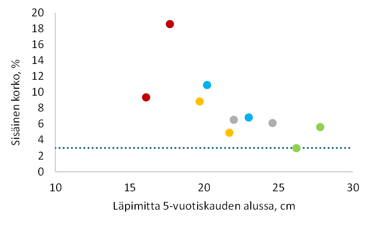 Nykyhinnoin laskettu sisäinen korko eli puihin sidotun pääoman tuotto on viidessä mittaamassani puussa ollut keskimäärin 8 %. Jos puun hinnannousu otetaan huomioon, sisäinen korko on 12 %. Näin suuri sisäinen korko kertoo, että metsikön kasvattaminen on ollut sijoituksena erittäin kannattavaa.