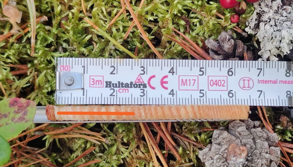 Valitsin puista ruhtinaallisen viiden puun satunnaisotoksen ja mittasin valituista puista pituus- ja läpimitan kasvun kahtena menneenä 5-vuotiskautena (ensimmäinen ja toinen 5-vuotiskausi hakkuun jälkeen). Jaoin puut optimaalisesti tukki- ja kuitupuupölkyiksi, ja laskin rungon arvon nyt, 5 vuotta sitten ja 10 vuotta sitten.