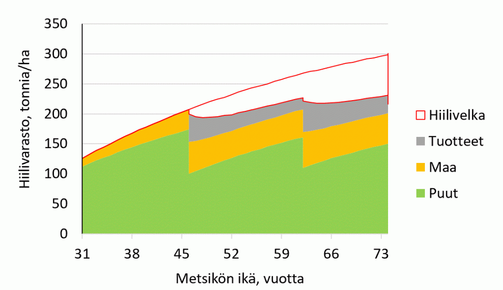 Kuvassa 1 on laskelma istutusmetsän hiilivarastojen kehittymisestä, kun puutuotteet ovat suunnilleen samat kuin Suomessa nykyisin ja lähtökohtana on aiemmin metsätön maa. Molempien harvennushakkuiden seurauksena hiilivarastot (puusto, kuollut orgaaninen aines eli ”maa” ja tuotteet yhteensä) pienenee siihen verrattuna, että metsän annettaisiin kasvaa ilman hakkuita. Erotus (kuvassa nimellä hiilivelka) siirtyy ilmakehään maapalloa lämmittämään.