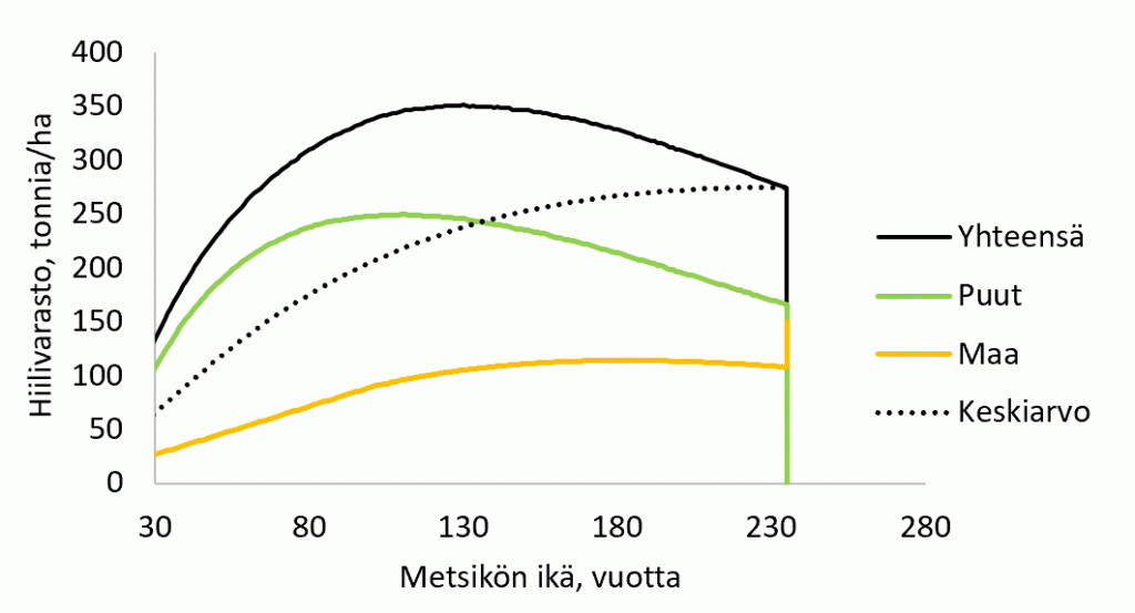 Olen arvioinut, että luonnontilaisessa metsässä olisi Keski-Suomessa 350 tonnia alkuainehiiltä hehtaarilla, kun sitä tämänhetkisissä hoitometsissä on vain noin 130 tonnia, kun myös puutuotteiden hiilivarastot otetaan huomioon. Erotus (220 tonnia per ha) on hiilidioksidina ilmakehässä maapalloa lämmittämässä. Talousmetsän ilmastoa lämmittävä vaikutus jatkuu niin kauan kuin metsiä hoidetaan. Hoidon lopettamisen jälkeenkin kestää vielä vähintään sata vuotta, jotta hiilivarastot palautuvat luonnonmetsien tasolle.