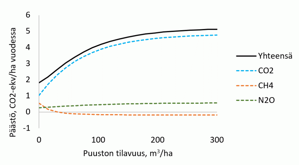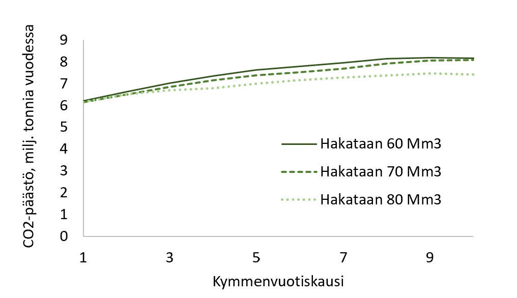 Kuvassa 4 on tuloksia koko Suomea koskevasta hakkuulaskelmasta, joka perustuu 4500 VMI-koealan otokseen. Laskelmassa maksimoidaan nettonykyarvoa sillä rajoituksella, että hakkuumäärä (tukki + kuitu + energiapuu) on joka vuosi sama (60, 70 tai 80 miljoonaa kuutiometriä). Kuvasta 4 nähdään, että lisääntyvät hakkuut vähentävät suometsien maaperäpäästöjä, koska puuston haihdutus vähenee, jolloin hapellista turvetta on vähemmän.