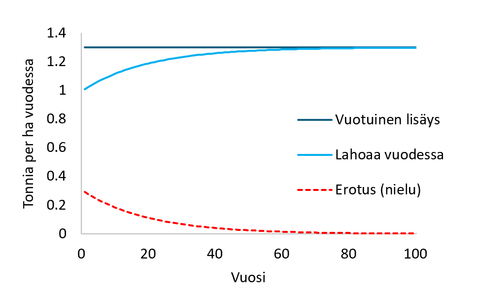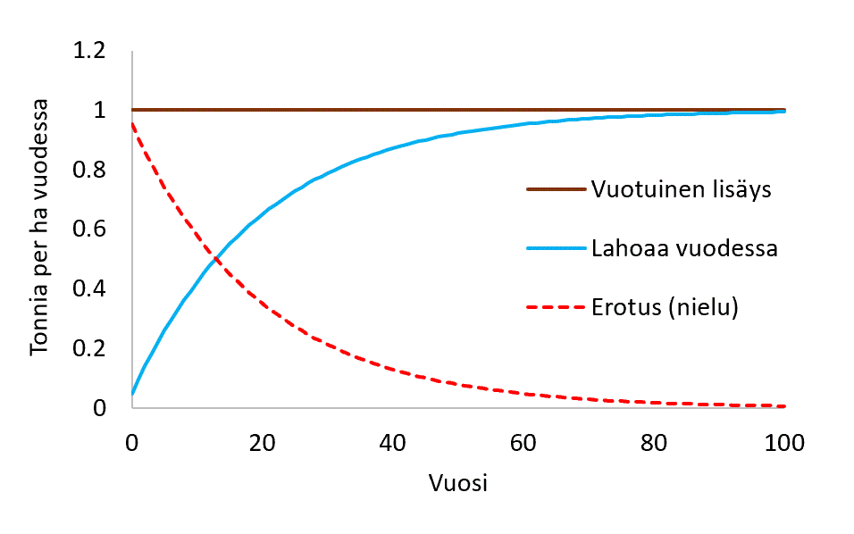 Jotta metsämaa olisi jatkuvasti hiilinielu, kuollutta ainesta olisi tultava joka vuosi enemmän kuin edellisenä vuonna. Jos kuollutta ainesta syntyy joka vuosi saman verran (input), lahoamisen hiilipäästö (output) saavuttaa jossakin vaiheessa vuotuisen lisäyksen, jolloin metsämaan hiilinielu on nolla (kuva 5). Jos siis Suomen tai Ruotsin metsiä käsitellään pitkiä aikoja niin, että metsien rakenne ja hakkuumäärät ovat suunnilleen vakiotasolla, metsämaan hiilinielu asettuu nollan paikkeille.