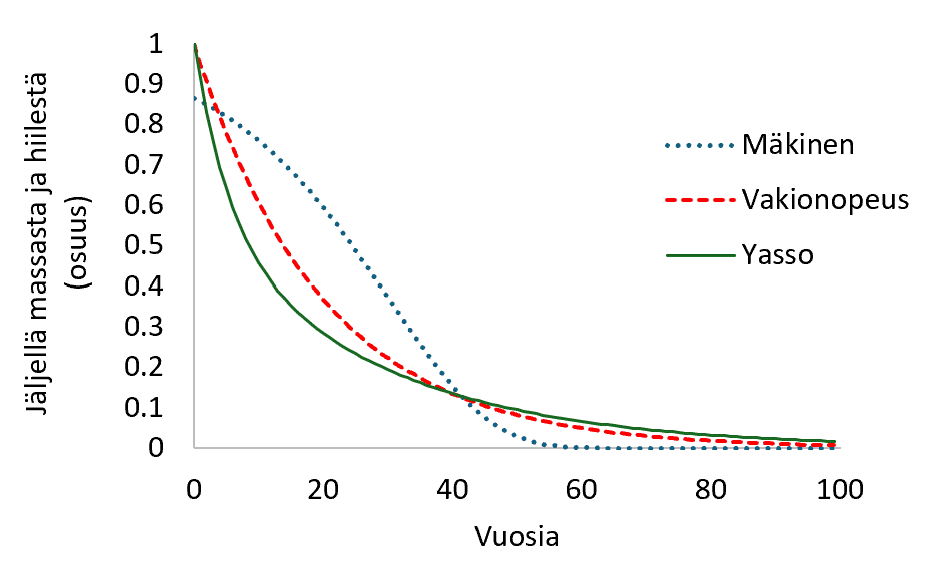 Kuvat 5 ja 6 siis osoittavat, että hakkuutähteet eivät voi olla pysyvä hiilinielu, ellei hakkuita lisätä joka vuosi hamaan tulevaisuuteen saakka. Mikä tahansa järkevä laskentatapa, Yasso-malli mukaan lukien, johtaa samaan tulokseen (kuva 7).